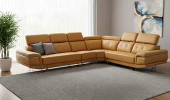 Pioneering sofa design to complement your big spaced lounge. The beautifully button tufted and pleasantly sewn fabric with adjustable head rests will allow you to relax in your best angle. Stainless steel detailing along with the elevated triangular footing will